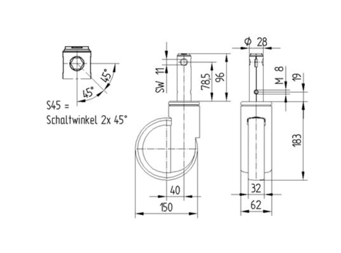 2044UAP150R26-28S45 – suunnanlukittava sairaalasängyn pyörä, tappi 28/96
